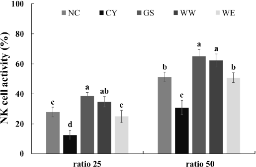 Chiết xuất mầm lúa mì cho thấy tác dụng tăng cường hoạt động tế bào NK tương đương với chiết xuất hồng sâm có sẵn trên thị trường. Theo kết quả kiểm tra ANOVA, hiệu quả của nó cho thấy xu hướng tuyến tính hoặc cao hơn với liều lượng tăng.