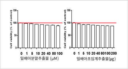 Tiến hành thử nghiệm độc tính tế bào của chiết xuất mầm lúa mì bằng cách sử dụng tế bào RAW264.7 (đại thực bào). Tế bào RAW264.7 được sử dụng làm đại thực bào trong các thí nghiệm in vitro. Đại thực bào tham gia vào phản ứng miễn dịch bẩm sinh, và thí nghiệm đánh giá hoạt tính điều hòa miễn dịch của các chất bằng cách đo sự tiết oxit nitric (NO) và cytokine được tạo ra sau khi kích thích bằng LPS (lipopolysaccharide) và các kích thích khác.